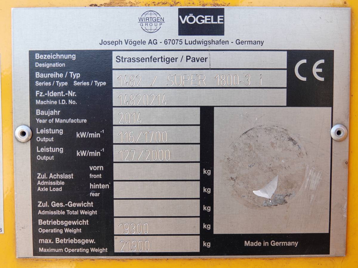 This used Vogele Super 1800-3i Asphalt Paver from 2014 has an engine power of 127 kW and counts 7685 operational hours. Bought from the first owner. The total weight of this Vogele Super 1800-3i is 19300 KG kg and the dimensions are 6.00 x 3.00 x 3.90 Metres. Furthermore, this Super 1800-3i is equipped with Heated Seat , Central greasing. The Vogele Asphalt Paver also has a CE marking. Do you want more information or do you want to try the Vogele Super 1800-3i at our yard? Please let us know.